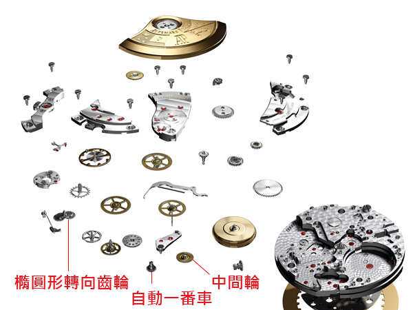 橢圓形轉向齒輪可根據一番車轉動的方向,決定由左邊或是右邊的小齒輪來推動自動三番車,然後連接的自動四番車依序將能量傳遞至自動五番車,而六番車連接著發條盒上的大卷車。但是五番車是一個離合棘輪,它能確保在手動上鍊時,大卷車所轉動的能量不會傳遞到上鍊齒輪系,避免使自動盤轉動。因此這一組精密的雙向自動上鍊系統,整體結構簡單,而且不容易故障。為了確保機芯擁有更卓越的上鍊效能,廠方後來推出修改版本的橢圓形轉向齒輪,在結構與齒輪形狀都有所改變,在日後的保養維修過程中,都會主動更換。