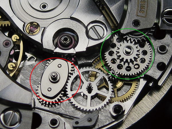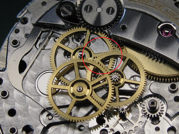 除此之外,3120機芯採用與2120自動機芯相同的雙向上鍊輪系結構,共有7個相連的齒輪系,其中機芯夾板上可看見是自動一番車齒輪,它是由上層的黃色齒輪與下層的齒輪軸組成,而下方的齒輪則連動著橢圓形的轉向齒輪,這一個轉向齒輪(可左右擺動)分別由兩個小齒輪所組成,然後連接著自動三番車(只能單向轉動,採用倒勾齒牙)。