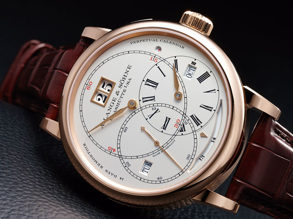 其中新款的 "Terraluna" 腕錶是朗格今年最重要的作品,它具有朗格大日曆顯示的萬年曆、14天動力儲存(六點鐘位置)和恒定動力擒縱系統。因為14日天的動力,在發條上緊的前後,發條的力矩會有頗大的差異,所以需要恒定動力擒縱系統。