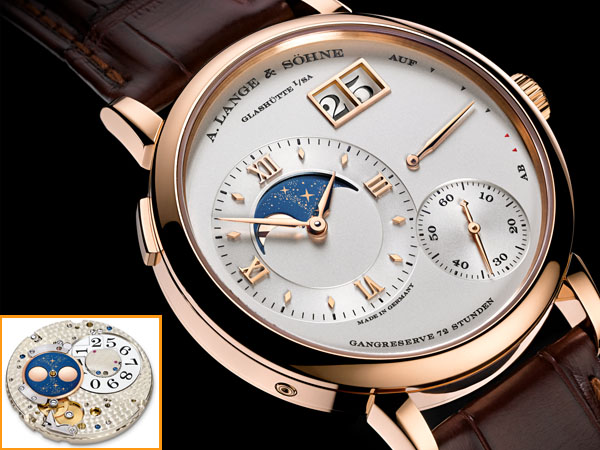 而另外一款Grand Lange 1 Moonphase腕錶,它將原本Lange 1 Moonphase腕錶位於五點鐘位置小秒盤上的月相盈虧顯示功能,挪移到左側的時、分指針面盤上,讓月相盈虧視窗更加清楚。同時廠方也使用全新的L095.3型手動上鍊機芯,具72小時動力儲存。