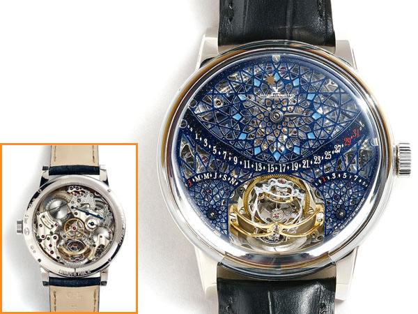 為了加強此腕錶的視覺效果,陀飛輪的開口處採用階梯式設計。階梯面盤上同樣經過手工雕鑿,另外Sphérotourbillon球形陀飛輪的下方,以藍寶石水晶製作透明錶橋,再加入上下兩塊突出式的藍寶石水晶玻璃,使得整個錶殼只剩下中央一層,故配戴者會感覺陀飛輪像是在半空中漂浮。