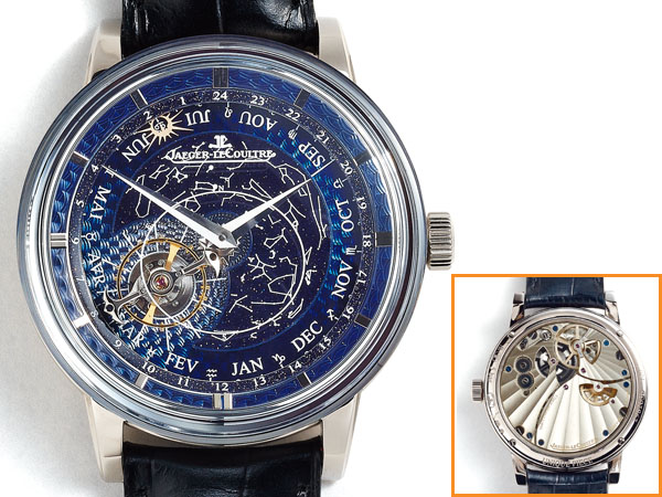 面盤採用寶藍色的砂金石,積家指出該色彩介乎於靛藍與暴風雨天空的深藍之間,有著無比神秘的感覺。面盤的下方顯示月份,裝飾扭索飾紋並覆蓋半透明漆料,錶圈內緣有月份標記,標示一年內任何時間的星座位置。邊緣有一顆金色太陽,每繞面盤一圈,正好是一太陽日,也就是24小時整。