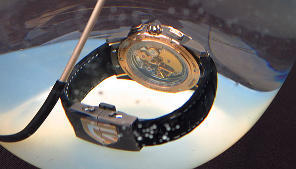 本文的兩張圖片都是在水中拍攝,水與玻璃讓腕錶展現出與常不同的美感。事實上,除了防水之外。CHRISTOPHE CLARET Allegro腕錶的ALG89手動機芯還使用了新的報時調速器,它不但能讓報時韻律不疾不徐,而且還完全無聲,局部透明的裝置可以欣賞到的運作的情況,完全不發出噪音是因為採用了磁性調速設計,沒錯,這與寶璣音樂錶的磁性調速器的原理相同,甚至長相神似,但設計細節略有不同,各有千秋。