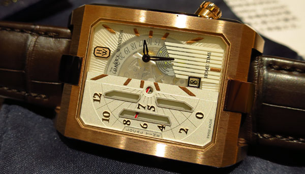 海瑞溫斯頓首次以歐米茄的Sedna打造腕錶,這種材質色澤溫暖,而且不會隨著時間而退色。其錶盤與兩地時間功能的設計十分特別,右邊以半透明磨砂玻璃做為錶盤,用以顯示當地時間。右半邊則是逆跳的原居地時間顯示,靠近整個面盤中央的小圓視窗是24小時制的日夜顯示,拉出錶冠調整原居地時間時,紅色指針會隱藏起來,只要將日夜顯示調到正確,按回按把後,紅色指針將只會出現在相對應的正確位置。