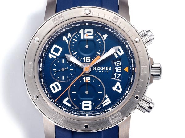 愛馬仕旗下唯一使用橡膠錶帶的Clipper系列,以休閒、水上運動為主題。可旋式錶圈上有六個凸點,靈感源於19世紀木製帆船上的舷窗外型,本款在2011年時推出,是目前最大尺寸44mm,與2010年前代相較不同的是,日期窗從單一顯示變成一次顯示前後2天,面盤設計並融入了愛馬仕對於馬術的熱愛,像是計時碼錶盤外框,以及中央向下內陷都為馬蹄形狀,都為錶款增添層次視覺。一共推出3種色系,本款是藍色系,搭配著象徵品牌的橘色指針,搭載ETA 7750自動上鍊機芯。