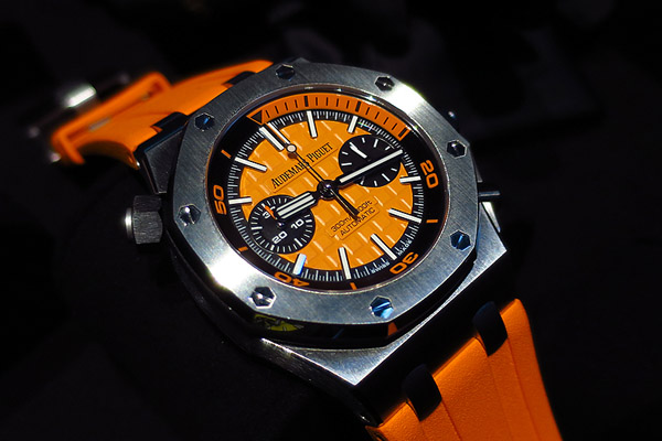 皇家橡樹離岸型計時碼錶今年玩弄的色彩,透過輕快明亮的色調,為錶款代入更多年輕氣息。橘色面盤,橘色膠帶。也有黃色與翠綠以及藍色版本的不同配色,僅限專賣店販售。