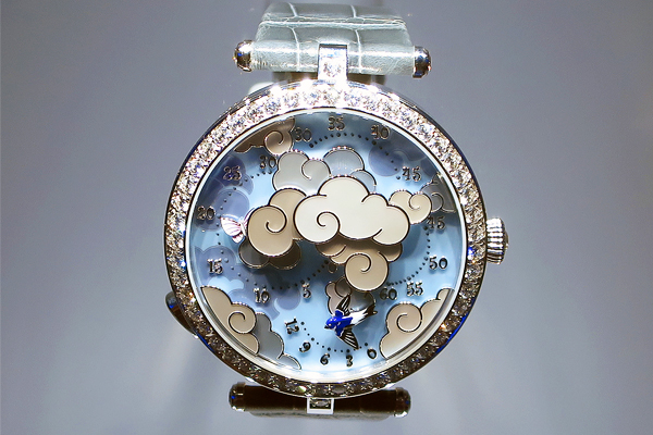 展前便收到風聲的這款Lady Arpels Ronde des Papillons,以蝴蝶為主角,描繪出如童話一般的場景。但,注意,這是一只複雜腕錶。下方的燕子為逆跳小時指示。特別的是分鐘指示,是隱藏於雲朵之間忽隱忽現的三隻彩蝶。透過特殊的轉盤分軌,三隻蝴蝶會依序從雲中飛出指示時間,相當可愛。而過往,VCA複雜錶款的底蓋大多也就刻上與面盤呼應的圖像。而這此底蓋也有文章,雖然還是把機芯包緊緊,但採用轉盤設計,讓底蓋的彩蝶也能翩翩起舞,也頗有趣味。當然,此刻不該下什麼新XX蝴蝶夢之類的標,此情此景更像杜甫《江畔獨步尋花》詩中所寫:「留戀戲碟時時飛」的感覺吧?
