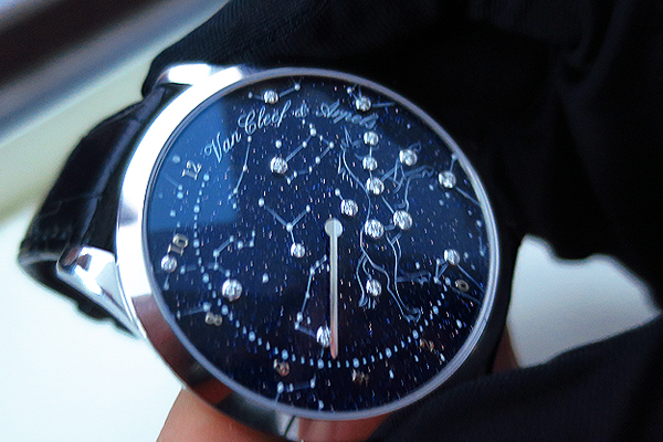 華美亮眼是VCA唯一的要求,而如何達成,品牌一向沒有太多包袱。所以囉,怎樣招數用來都不唐突。今年此款Midnight Nuit Lumineuse再度次以星空為主題,以砂金石玻璃為面盤,點綴星海並特別描繪出獨角獸星座。但,生猛的是,品牌跳脫傳統製錶的框架,機械機芯與電子結構結合(這算是歷峯集團旗下品牌今年第二款機械與電子結合的機芯),但不用於走時,而是用於發光,對!發光。利用壓電原理,按下按把產生電能,使機芯內含的磁條震動產生電能,進而使面盤上的七顆發光二極體,也就是LED發出光芒,讓這面盤星空更加閃爍。不過..目前只是概念錶...正式上市還要等一下。