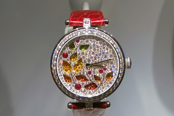 今年VCA的另一款複雜詩意腕錶,是看來感覺很不複雜,但卻極端光彩的Lady Four des Fleur,鑲滿鑽石與有色貴寶石的面盤與錶殼,相信在陽光下會閃得讓人睜不開眼。但是,這確實是一只複雜錶喔!中央時分指針,沒有時標,可見看時間是依據經驗法則判斷。而如此安排也有目的的。這錶盤,是會轉動的!面盤分為上下兩層,上層鑲鑽面盤留下葉片形狀鏤空。而下層則以多種不同顏色的貴寶石鑲嵌出漸層圖案。下層錶盤每12小時轉動一圈,面盤每12小時轉動一圈,一日兩圈,轉動出四季變化。