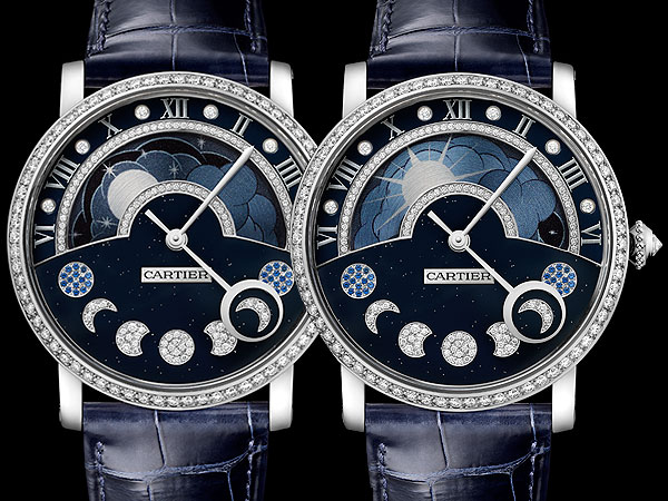 1912年開始,卡地亞就熟稔於以機械時計表現與眾不同的月相顯示,此後不論在座鐘或是腕錶作品上都有以此為靈感而發展出來的藝術時計,這款卡地亞Rotonde de Cartier晝夜逆跳顯示月相腕錶就是其中之一。這款腕錶集合晝夜顯示與逆跳月相兩種功能。面盤下方為逆跳月相顯示;藉由一根末端為鏤空圓形的指針指示鑽石或藍寶石組成的月亮,為腕錶帶來別開生面的表情。而面盤的上半部是以太陽、月亮碟盤搭配羅馬數字與鑽石時標來指示小時。由中央延伸而出的分針則是一小時轉一圈,與尋常設計無異。