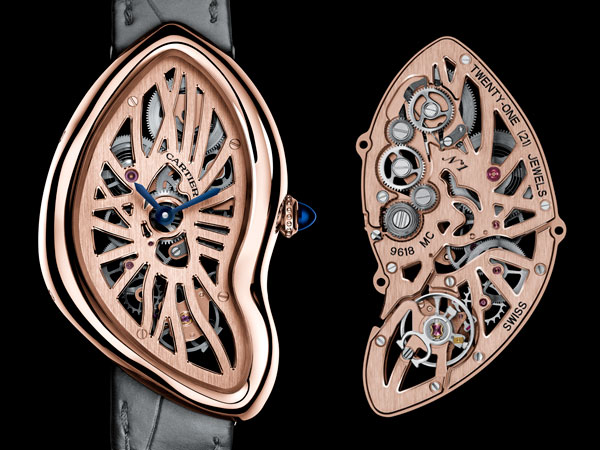 先前的鉑金款式令人意猶未盡,嶄新的玫瑰金款則帶來了更為溫潤華貴的風貌。一般的腕錶外型大概不脫圓形、方形、酒桶型,就算如此,裡面的機芯也多是圓形,連方形機芯都相對少見。但卡地亞Crash玫瑰金鏤空腕錶不但採用獨特的不規則錶殼,甚至連內置的9618 MC手上鍊機芯也是,可以說是從裡到外獨特到底了。