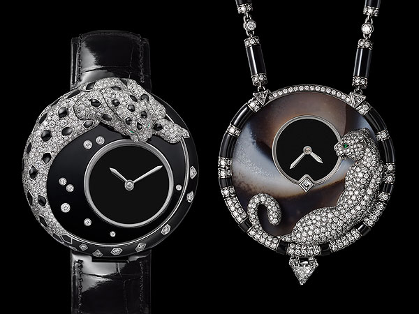 盤踞在美洲豹神祕小時腕錶上的美洲豹,從錶圈的環形逐漸變成立體的豹身、豹頭與豹爪,兩者相融於一體渾然天成,豹身鑲滿美鑽,眼睛為祖母綠,黑色斑點則與錶殼上的黑相同,都是珍貴的真漆。美洲豹綴飾錶則是運用了鑽石、瑪瑙、縞瑪瑙、黑曜石、祖母綠等寶石打造,斜躺在錶殼邊緣的美洲豹姿態優雅迷人。這兩個錶款內置的機芯都是卡地亞9981 MC手動上鍊機芯,若從機芯圖來看,就能發現傳動的機械輪系都隱藏在看不見的面盤下方,並與乘載指針的藍寶石碟片相連。