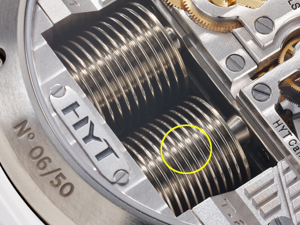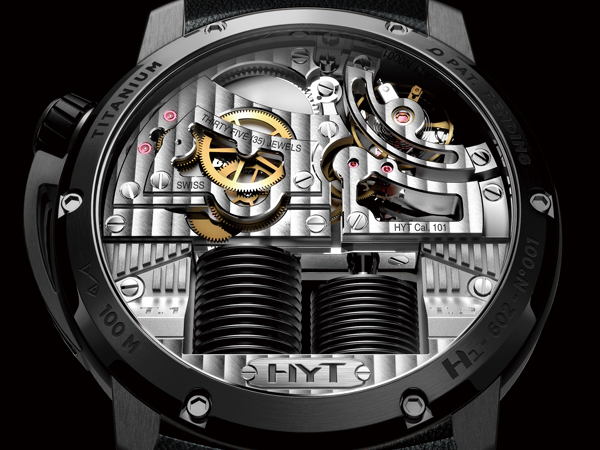 H1系列的錶款皆搭載101手上鍊機芯,而本枚機芯的最大特色,就是環繞於面盤外圍的環形透明管,以及面盤下方的風箱狀儲液槽。而左側的儲液槽裝載螢光或有色液體,右側的儲液槽則裝載透明黏性液體,透過兩種不同顏色液體在透明管內移動,產生時間指示效果。不過機芯的上半部,其實已經是一個完整的機芯,只需再加裝了兩齒輪與時針,便可顯示時間。因此HYT的液體顯示系統,是由機械機芯推動運行,並且獨立於機械結構外的零件;透過密封與防震測試,可確保液體不會外漏。
