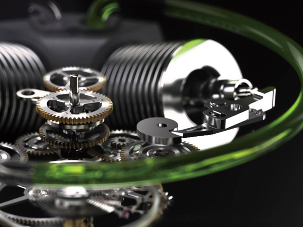 由機械結構控制液體顯示 H1 101機芯的液體都是密封在玻璃管與兩個風箱狀儲液槽內,需透過機芯內的機械結構,才能使液體顯示系統運作。其模式是透過一個連接分鐘輪的額外輪系,在末端齒輪下方裝置如同鸚鵡螺造型的凸輪(紅圈),並連接槓桿零件與活塞連桿。當凸輪緩慢轉動時,槓桿與活塞連桿會逐漸壓縮左側的儲液槽(螢光色),使玻璃管內的液體顯示時間;當槓桿零件移動至凸輪的最高點然後落至最低點,便是液體系統從右側的六點鐘返回左側,像是傳統的逆跳指針那樣。