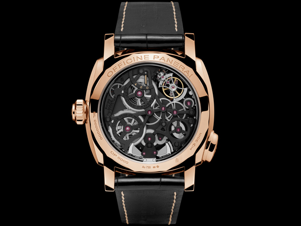 整枚腕錶的正面視覺配置,大部分依照過去沛納海鏤空陀飛輪如PAM 348、PAM 528的設計,例如11點鐘位置仍是雙軸斧形框架360度旋轉陀飛輪、三點鐘為日夜指示、鏤空的格柵面盤,同時也因為三問的加入而有所更動,包括九點鐘為小秒鐘再加入兩地時間報時指示,在六點鐘位置也可看見三問零件的報時槓桿,當報時進行時,就能看見槓桿的依序運作。