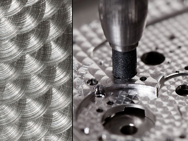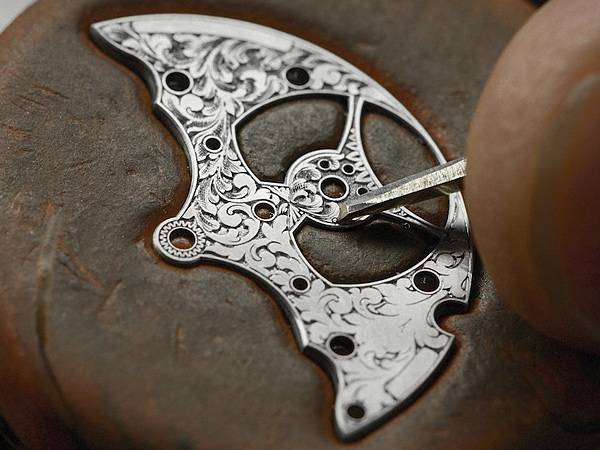 雕刻機芯有許多方法,像是雕刻範圍廣大的產品,通常會使用電腦車床(CNC)來完成,其他像是雷射、化學雕刻或是縮圖器也是常用來進行這種類型的雕刻。至於手工雕刻,則複雜多了。在顯微鏡下仔細雕刻,一刀刀的刻出圖案,因此相當耗費時間,並且製作過程必須非常謹慎仔細,才會雕刻出精緻漂亮的紋路。