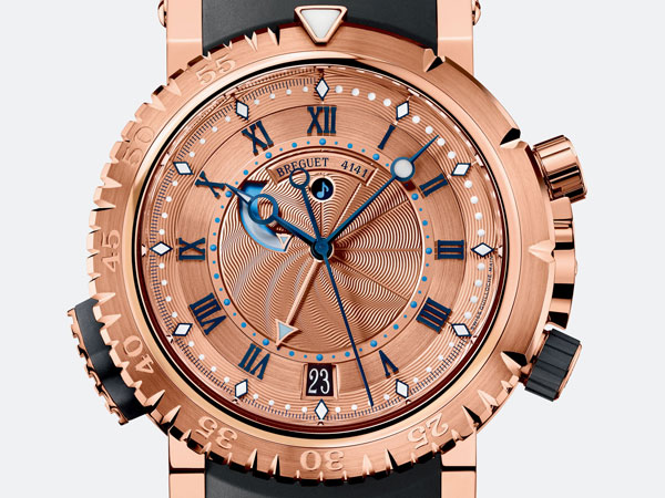 即便這是款充滿功能性的腕錶,卻沒有失去寶璣品牌該有的優雅。帶有雕刻花紋圖樣的玫瑰金面盤與黑色橡膠錶帶,以及18k玫瑰金單面旋轉錶圈彼此顏色造型都十分搭配。Marine Royale 5847腕錶的6點鐘位置擁有日期窗,10點鐘位置具有動力儲存顯示,12點鐘位置則是此錶的靈魂是否醒著-響鈴啟動顯示。