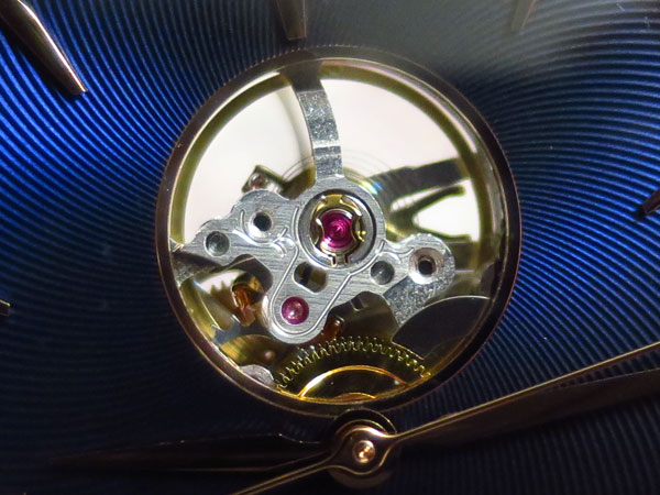 乍看會以為這是一只深藍色面盤的腕錶,但在不同角度下欣賞時,就可以發現隨著反射光線的變化,會呈現出明亮到深沉的藍色,且整個藍色面盤上的雕刻紋飾從12時位置的擺輪視窗放射而出,不只漂亮,而且隨著光線的波動,還頗有動感。戴在手腕上時,一舉一動都會在面盤上映出不同的藍色光芒,要人不注意都難。