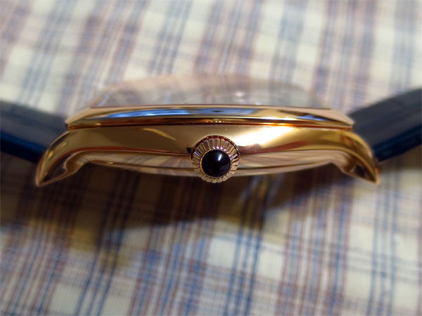 酒桶型錶殼雖然較圓形更給人與眾不同的美感,也更考驗設計功力。這不只是美學上的考驗,同時在人體工學上也是一樣,如果沒有考慮到人體工學,酒桶型的錶款戴在手腕上時,很容易滑來滑去。因此EMPORIO ARMANI Swiss Made特別在錶耳方面下了工夫,從側面看可以發現錶耳向下彎曲,這就是為了使佩戴更為服貼舒適。