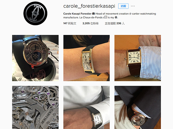 小編打賭前面兩位人士許多愛錶人士應該都認識了,但是接下來這位Carole則是另外一個故事了。Carole十分低調,卻是卡地亞過去幾年來所有女性腕錶的幕後推手。她不只著手於卡地亞自製的1904機芯,還有許多特別款式的腕錶,像是天體運轉式陀飛輪(Astrotourbillon)以及卡地亞的逆跳腕錶。Carole可說是現今世界鐘錶界中最重要的女性之一,因此她的IG怎麼能不follow呢!