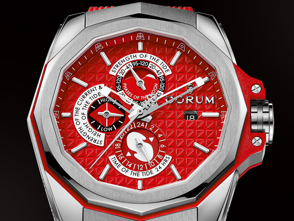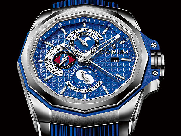 CORUM Admiral’s Cup AC-One 45 Tides錶殼直徑45mm,鈦金屬錶殼,藍色或紅色PVD塗層面盤,招牌12邊形錶殼辨識度很高。