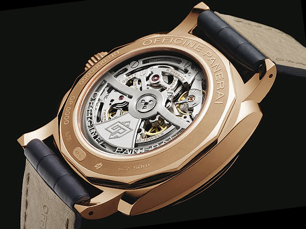 最後一款要與大家介紹的為Radiomir 1940 10 Days Automatic Oro Rosso 腕錶(PAM00659),它是最吸引小編眼球的一款,光看直徑45mm,玫瑰金錶殼,搭配太陽紋藍面盤就有夠毒的了。PAM659搭載P.2003/10機芯,機芯設計成鏤空,為沛納海第一顆自製鏤空機芯,也讓欣賞透明底蓋時能增添更多樂趣。
