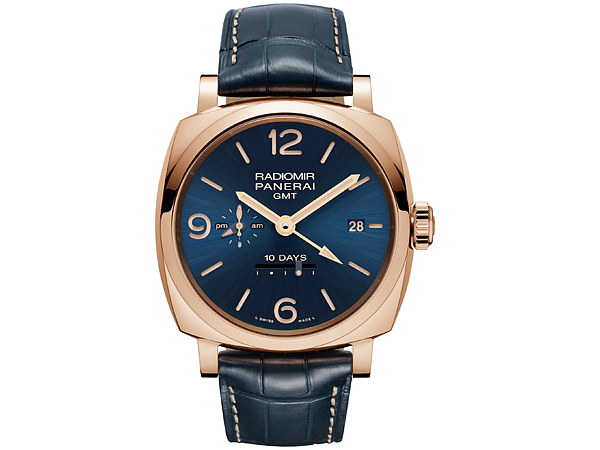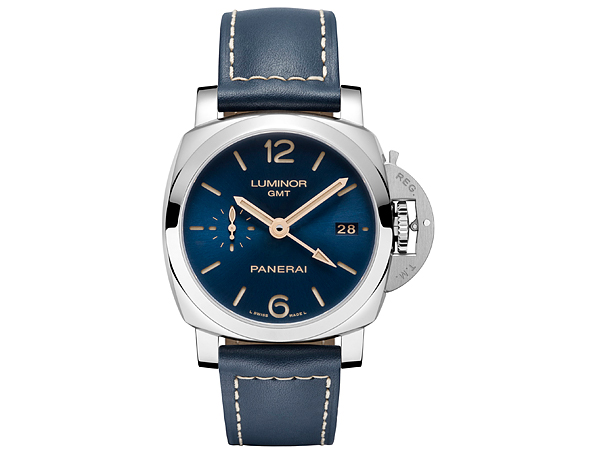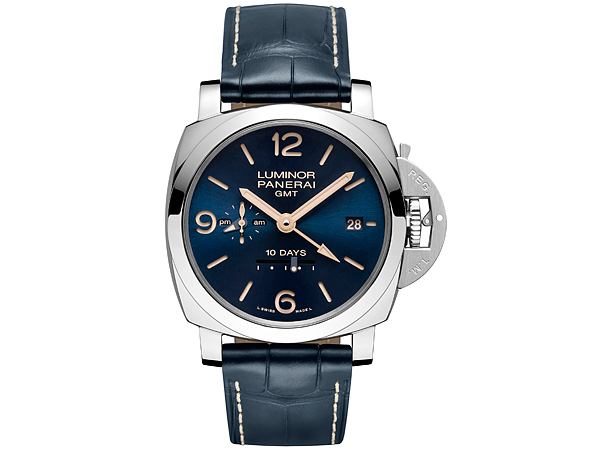 Luminor 1950 10 Days GMT Automatic腕錶(PAM00689)同樣使用不鏽鋼錶殼,不過錶徑較大,為44mm,設計也較為複雜。此款搭載P.2003自動上鍊機芯,並擁有10日動力儲存。它包含了日期以及第二時區等功能,並以線性方式來顯示動力儲存。9點鐘位置擁有小秒盤以及日夜顯示,讓佩戴者能掌握日夜時間。此款沛納海同樣限量300只,也是搭配與面盤同樣藍色系的錶帶,參考價約為新台幣430,000。