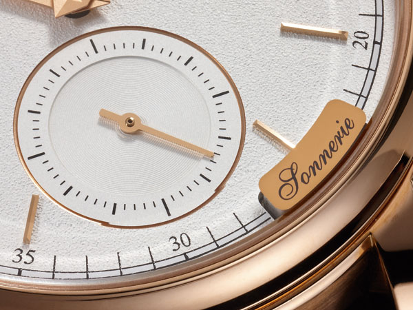 除此之外,錶款採用非傳統的報時按把結構,雖然外觀看似傳統的三問滑桿,但實際操作時,才會發現這是按把結構。與其他的的三問腕錶相比,此錶款搭載了全新的安全系統,即使在三問報時裝置啟動時,再次按下按把,三問功能也不會重新開始運作,避免對機芯造成傷害。