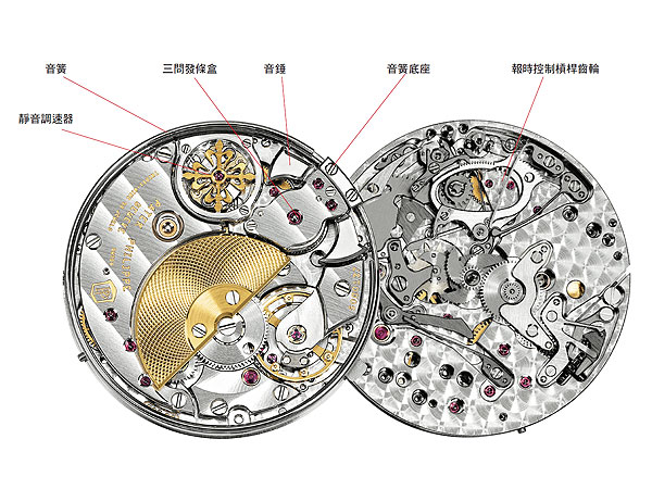 三問錶的報時聲音來自於音錘敲擊音簧(Gong),就像是敲擊三角鐵等等樂器,發聲原理聽起來似乎很簡單,但這聲音卻決定了一只均價超過30萬瑞郎的三問錶的優劣,尤其從同一個金屬製成、直徑小於1mm的音簧裡,居然可發出兩種不同、甚至更多的高低音頻,還具備不同的音色、音長、音調組合或餘韻,於此,音簧扮演了決定性的角色。