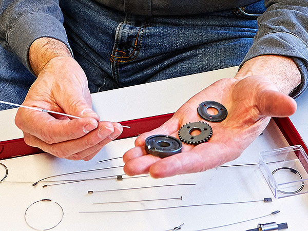 接著,Erard會將金屬棒進行延展,「這是整個製造過程中最困難的部份!」他把金屬棒置入他自行設計的模具中,在不加熱的狀態下,以金屬底座作為中心,從兩邊運用拉力慢慢將之延長、一步一步的降低金屬棒的直徑,光是這個步驟就需要兩個半小時、15次不間斷的重複作業。再來以200至240度的高溫提高硬度、穩定音簧於金屬底座的連接位置,讓音簧不致受震動而從底座連結處斷裂。