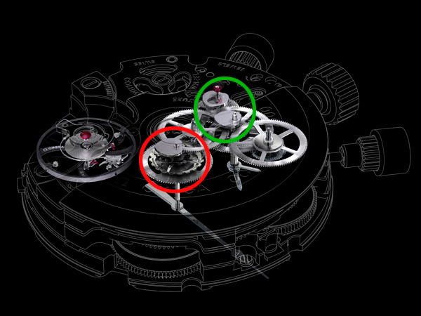 因為以往的計時碼錶,幾乎都採用分離式的計時錶盤,主要的原因就是結構比較簡單;但是30分鐘的計分盤,閱讀的效果的確比較差,使用者還要換算一下累積的數字,因此部分錶廠改用60分鐘計時盤,結合與計時盤同軸的設計,觀看計時結果變得方便許多。而9300自動機芯,也使用相同的結構,位於3點鐘位置的同軸計時盤,上方的指針是60分鐘計時指針,而下方的指針則是12小時計時指針;位於九點鐘位置的是走時小秒針,可透過錶冠拉出第二段的停秒功能,來精確的調整時間。