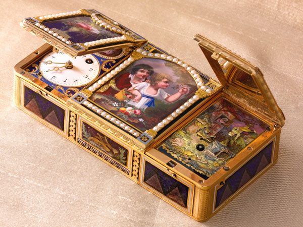 其他附註:長93mm 黃金錶殼,約1800年製,芝麻鍊手動機芯,活動人偶、音樂報時功能。