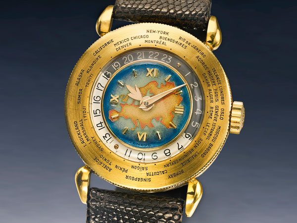 其他附註:直徑31 mm 18K黃金錶殼,約1949年製,12-210手動機芯,世界時間顯示。
