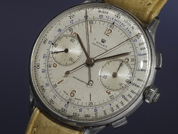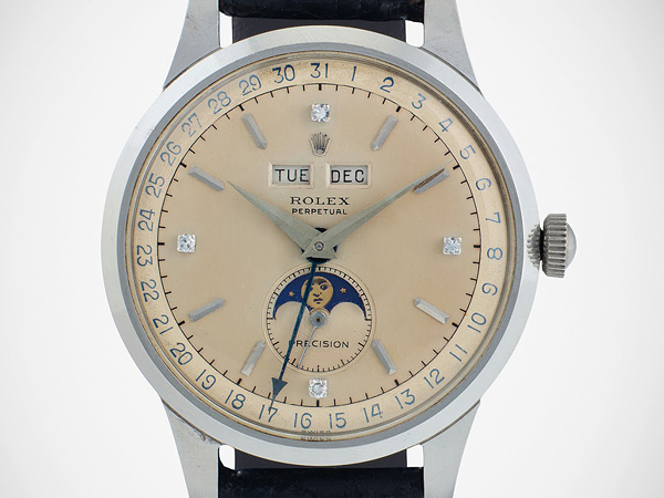 而在2013年12月的紐約佳士得拍賣會上,這款擁有月份、星期、日期的全曆的不鏽鋼Rolex Ref. 8171月相腕錶則拍賣了1,145,000美元的好成績。佳士得表示標下這只腕錶的收藏家為義大利人,因此給其取了義大利薄餅(Padellone)的綽號,小編覺得顏色還挺像的呢!這款腕錶製造年份大約在1953年,直徑38mm,採用Cal. A.295 CPL自動上鍊機芯。面盤上的3、6、9與12使用方鑽當作時標,星期窗與月份窗則使用英文字母縮寫。至於日期則以阿拉伯數字呈現於面盤外環,利用箭頭指針來指示。