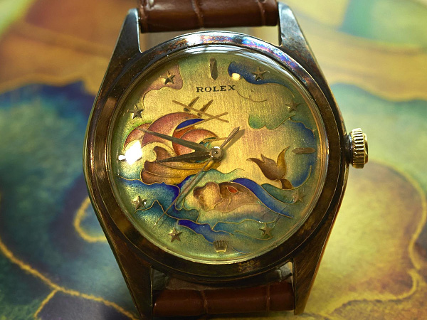 最後則要來看看這只掐絲琺瑯(cloisonne enamel)面盤的玫瑰金18K金勞力士Ref 5029,在2014時,同樣在佳士得拍賣拍出1,242,040美元價格,創下勞力士當時空前最高拍賣紀錄。這只勞力士面盤上的圖案小編在猜應該是海裡的巨魚與航行海上的船隻,至於為何會以這圖案作為主題小編不得而知。除了色彩鮮艷的面盤外,這只錶吸引小編的地方就是其時標。其時標不但設計成星型,6點鐘時標還設計成皇冠,是一只藝術價值很高的勞力士。這款勞力士錶殼又更小了些,直徑只有36mm,搭載G94451自動上鍊機芯,製造年份約在1949年。
