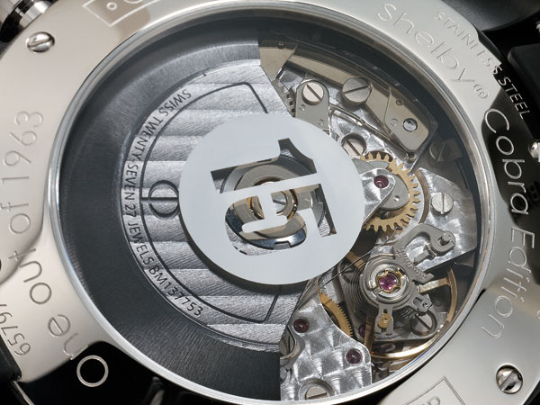 中央計時秒針尾端有眼鏡蛇標誌,呼應Cobra跑車之名。同樣呼應歷史意義的,還有透明底蓋壓印的數字“15”,以此紀念當年289 Cobra跑車以編號15號參與諸多賽事。圓柱型計時按把,末端加大,除了為設計帶來古典感,增加按壓空間也有助於機制的操作。