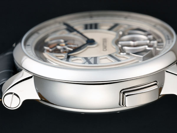 飛行陀飛輪籠架一如多數卡地亞高級鐘錶,採用C字型籠架,活動式游絲頭的設計也有品牌一貫風格。搭配不能調節慣性的擺輪,調校時必然要耗費不少心思。