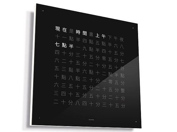 接下來就要了解一下她顯示時間的方式。用文字來表示時間應該很容易理解。不過,鐘錶的面積有限,如果要把幾點幾分都用文字完整顯示的話,在字數控制、編排和識讀性方面會有困難,因此Qlocktwo兼顧了美學與識讀性,想出了解決的方法。順道一提,她可不只能顯示時間,還能顯示日期和秒數哩!