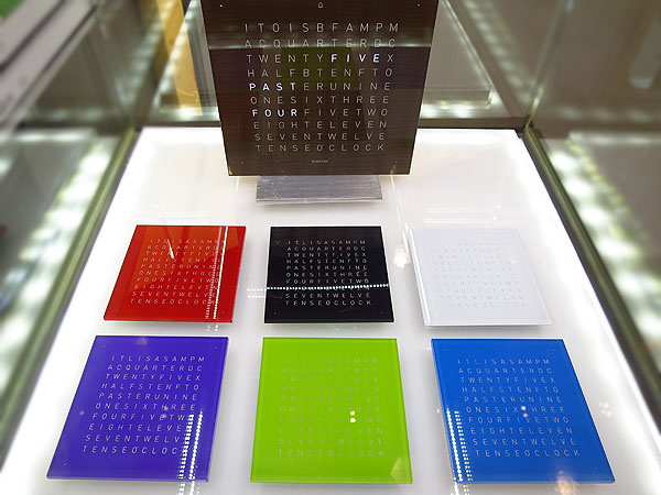現場陳列有壁鐘、桌鐘和腕錶,都是正方形的設計, 整體質感不錯。金屬的部分基本上是做緞面處理,邊緣都經過修飾,摸起來很滑順。金屬面板鏤刻出文字的部分邊緣整齊、平整;而壓克力面板印刷細緻、色澤飽滿,很賞心悅目。若是與瑞士的精品鐘錶相較,Qlocktwo的質感也毫不遜色。