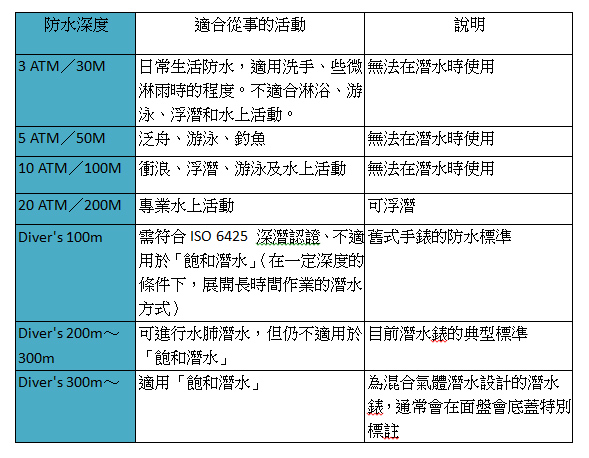 以防水深度來說,在水中上升和下潛的過程,都會讓手錶承受減壓和增壓的壓力差,再加上手錶內部用來防水的橡膠環圈,本身就會因為長時間使用、放置過久等因素導致彈性疲乏影響密合度,如果沒有定檢或保養,種種的因素加總起來,都會影響到手錶實際的防水度,所以實驗室中測試出來的30公尺,代表的也就不是實際的深度了。綜合以上的因素,其實可以說ISO的手錶防水認證,訂立了一項相對數值讓業界有參考依循的標準,和實際的深度產生的落差,等於是加入安全係數考量的謹慎評估。