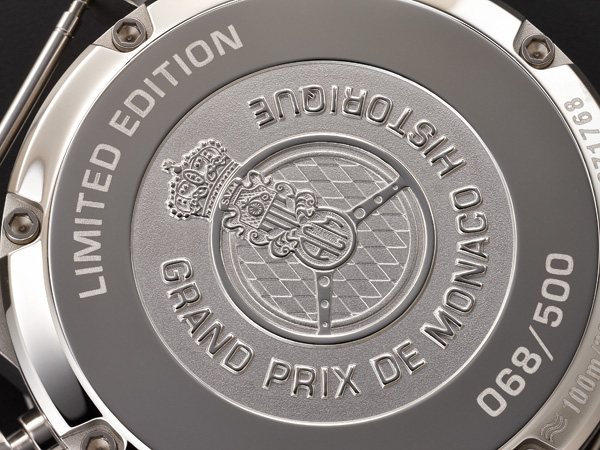 錶背的實心不鏽鋼底蓋,以立體鐫刻的方式烙上摩納哥汽車俱樂部徽章,限量編號也列於其上,而用螺絲鎖住底蓋的作法也十分古典,整體意象更為連貫。