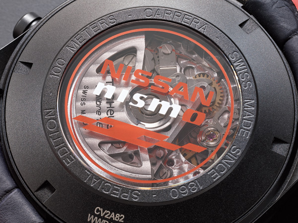黑色碳化塗層的鈦金屬錶殼搭配同色陶瓷圈,質地變得輕量,外型也很帥氣。背面透明底蓋上大大的NISSAN NISMO字樣,象徵泰格豪雅和車隊的合作。而隱身於其下的Calibre 16自動計時機芯,改制自ETA 7750,發條動力和計時結構的穩定性能都頗受肯定。