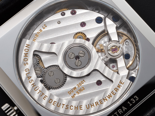 DUW 3001機芯採用類似3/4夾板的設計,僅有擺輪完全外露,而夾板上方的大小卷車同樣也是清楚可見。為了提高擺輪的穩定與抗震性,廠方採用水平雙臂式橋板設計,這是許多高級機芯所使用的結構。本枚機芯採用自製的Swing System擒縱系統,包括擒縱輪、擒縱叉與擺輪,經過高溫燒製的藍色游絲,亦是NOMOS的獨家專用零件。