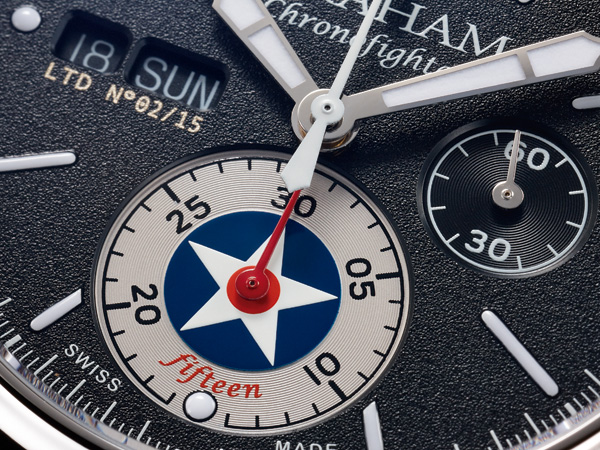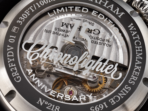 之所以限量15只,則是因為紀念系列發表15週年。品牌也接受有條件訂製服務。限量版本與一般版本,除了面盤軍徽外,透明底蓋的設計也有所差異。限量版本底蓋壓印草寫Chronofighter 15字樣。