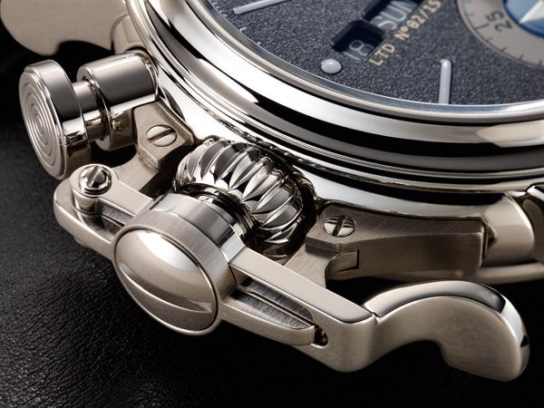 此外,計時結構的部分設計概念與單按把計時相同,將啟動、停止計時的按把與錶冠結合。而所延伸出額外的巨大按把適足以作為錶冠的護橋之用,可算是額外好處。而歸零按把,則設計在錶身側緣十點鐘位置。