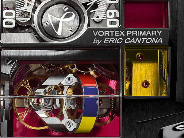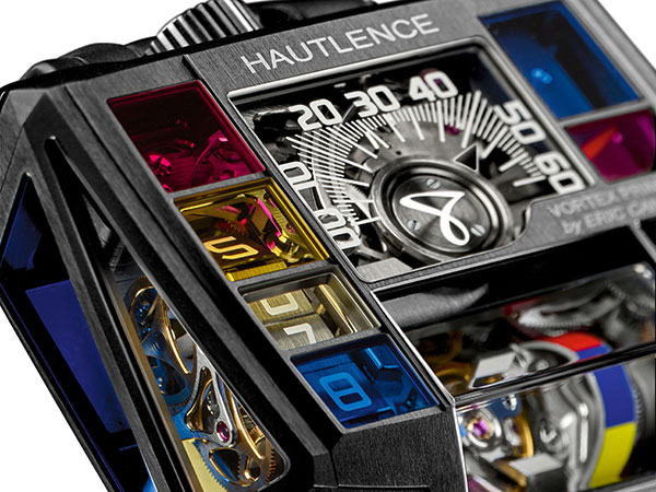 HAUTLENCE 2016年全新推出的Vortex Primary,是與品牌形象大使,前曼聯球員Eric Cantona合作的成果。錶殼切分出19個觀景窗,透過不同顏色的彩色玻璃拼貼,將機芯切割成不同區塊,各自呈現不同的斑斕色彩,創造現代藝術般的視覺。此外,錶背還留下EricCantona的指紋,概念頗為有趣。