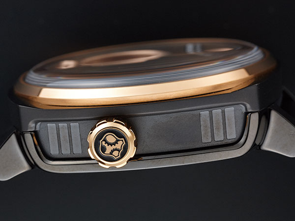 除了面盤外,錶款諸多細節的設計亦融入跑車元素。面盤的走時視窗、動力儲存顯示窗,很明顯是取法跑車儀表板。底蓋彷彿引擎室,而半隱於底蓋下的機芯自動盤,有些汽車輪框的設計感。而錶殼左右兩側,則以線條默默描繪車頭、車尾的樣貌。