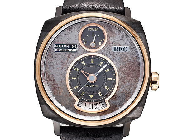 此款P-51的設計靈感來自於六零年代生產的野馬跑車,但可不只是將野馬的設計元素融入錶款之中。一如品牌名稱REC,來自英文單字Recycle、Recover、Reclaim,三者皆有回收之意,可想見品牌所想表現的再生精神,所推出的幾款腕錶,皆是選用不同經典報廢老車的版金做為面盤材料。