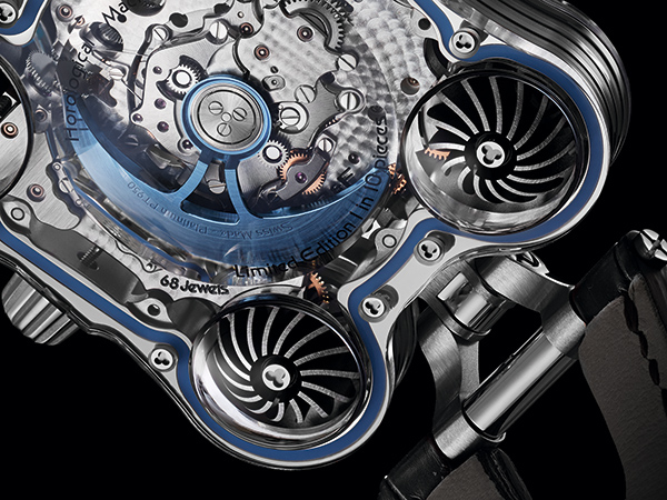 四個角的透明球體中,其中兩組各為小時與分鐘的球體時間顯示。如何推動與機芯走時輪系垂直的指針軸,進而轉動球體,相信在有了HM4的經驗後,這對MB&F已經不成問題。另外兩枚則是渦輪上鍊調節器。當招牌的戰斧形自動盤轉動時,調節器會產生製造微妙的風壓,避免上鍊效率過強,反而造成機芯損害。