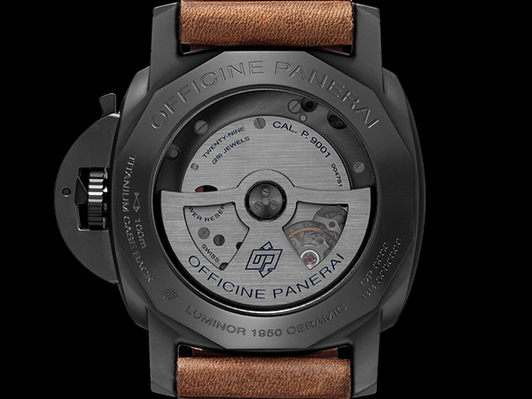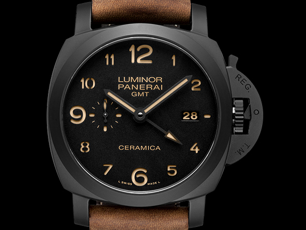 這樣的方法沛納海PANERAI的Panerai Luminor 1950 3 Days GMT Automatic Ceramica似乎給予解答,直徑44mm錶殼,以二氧化鋯(zirconium-oxide)陶瓷製作,讓維氏硬度提高到1,200,比不鏽鋼耐刮許多。不過這樣也是有代價,就是即便硬度變硬,但相對也變得更脆而容易斷裂,因此要小心別摔到了!這款腕錶搭載沛納海自製Caliber P.9001自動上鍊機芯,黑色三明治面盤與棕色皮錶帶搭配,毒呀!